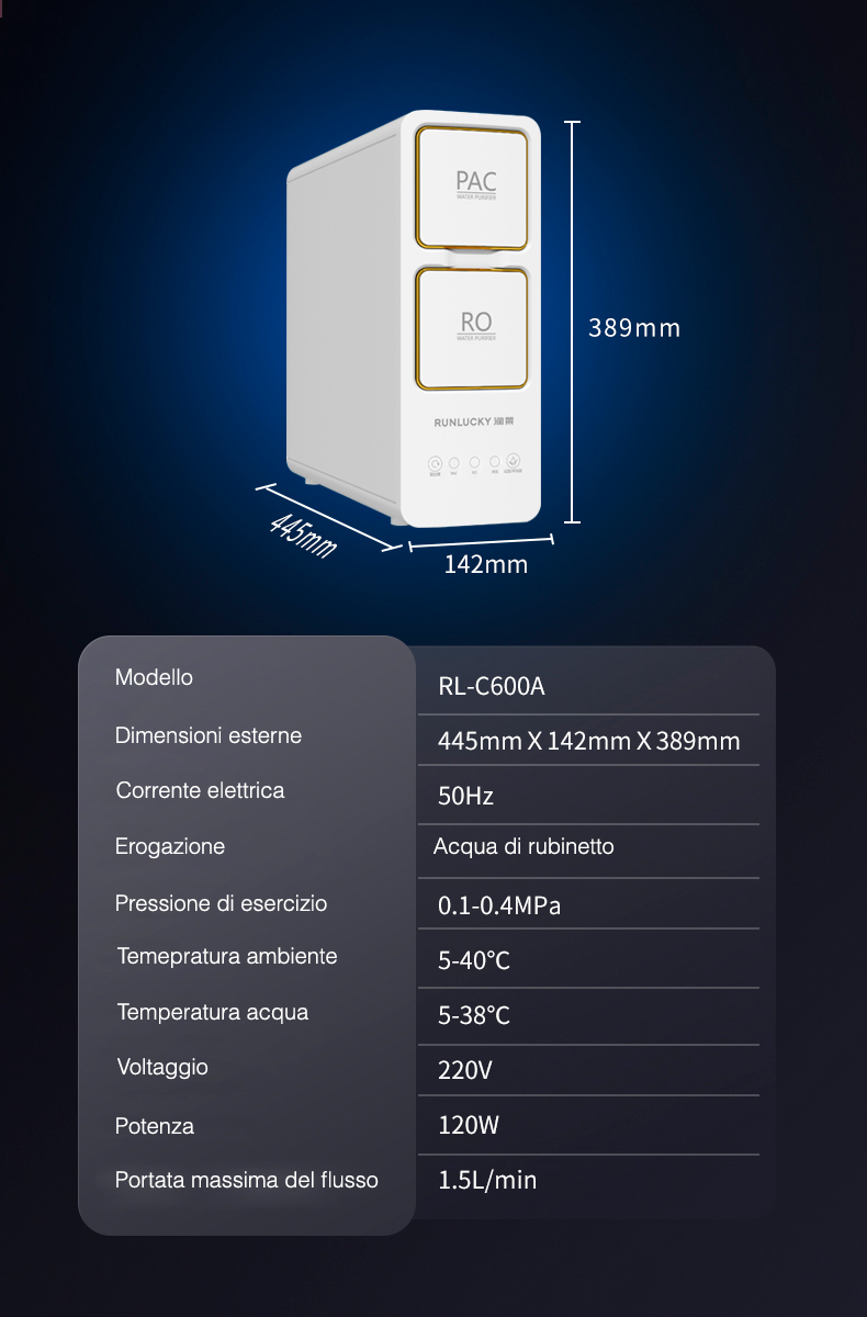 La tecnologia usata è quella dell’osmosi inversa, con una capacità filtrante giornaliera fino a 2270 litri (600G). E’ provvisto di 2 filtri di veloce e facile installazione, il che non richiede costosi e lunghi interventi di un tecnico.