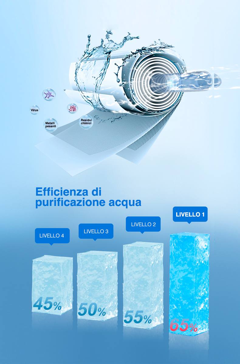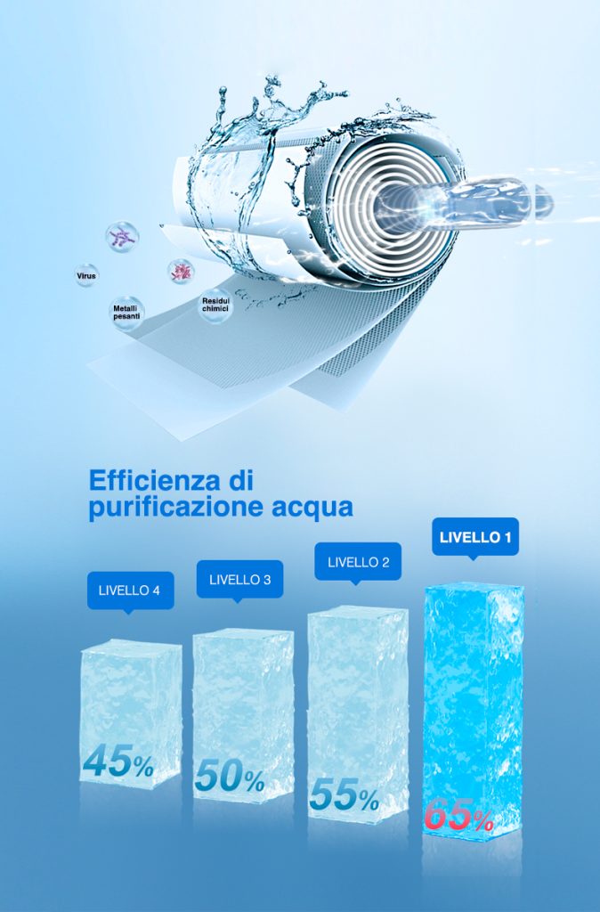 • Sistema di arricchimento/alleggerimento minerale: tramite questo sistema viene monitorata – con un sensore solenoide – la quantità di sali minerali e altre sostanze disciolte in acqua (TDS). Con questa soluzione la filtrazione si adatta automaticamente e rimuove la giusta quantità di sostanze indesiderate lasciando però passare i minerali importanti per la salute.