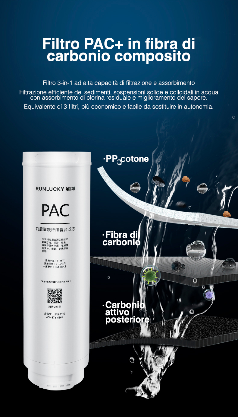 • Durata: La membrana ad osmosi prodotta da RunXin è più grande di quella della concorrenza ed è prodotta con una speciale tecnologia che consente a questo filtro di durare molto più a lungo delle altre. Infatti la vita media della membrama ad osmosi di RunXin è di 3 anni contro i 10/12 mesi delle altre marche.